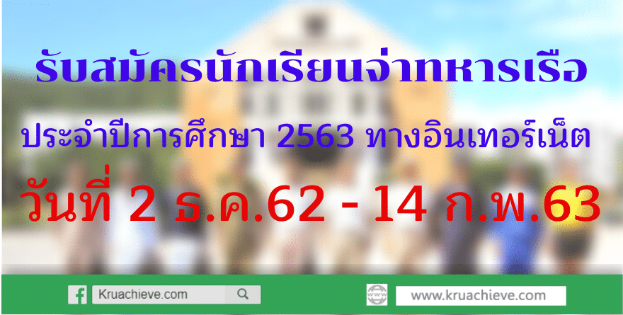 รับสมัครนักเรียนจ่าทหารเรือ ประจำปีการศึกษา 2563 เริ่ม 2 ธ.ค.62 – 14 ก.พ.63 ตลอด 24 ชม. กรมยุทธศาสตร์ทหารเรือเปิดรับสมัครนักเรียนจ่าทหารเรือ ประจำปีการศึกษา 2563 สมัครทางอินเทอร์เน็ต ตั้งแต่วันที่ 2 ธ.ค.62 – 14 ก.พ.63 ตลอด 24 ชม. ไม่เว้นวันหยุดราชการ
