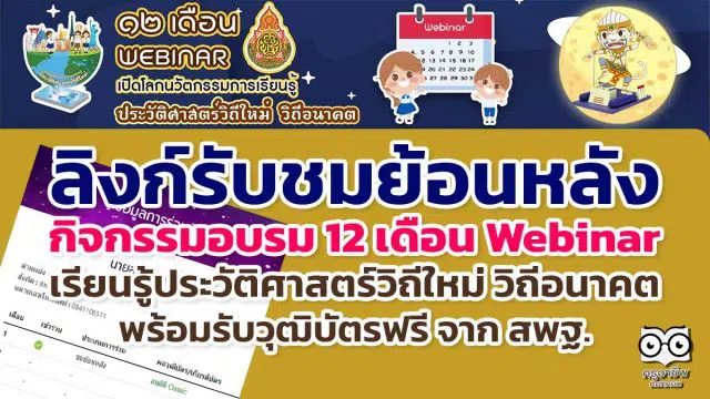 ลิงก์รับชมย้อนหลัง กิจกรรมอบรม 12 เดือน Webinar เปิดโลกนวัตกรรมการเรียนรู้ประวัติศาสตร์วิถีใหม่ วิถีอนาคต เพื่อรับวุฒิบัตรฟรี จาก สพฐ.