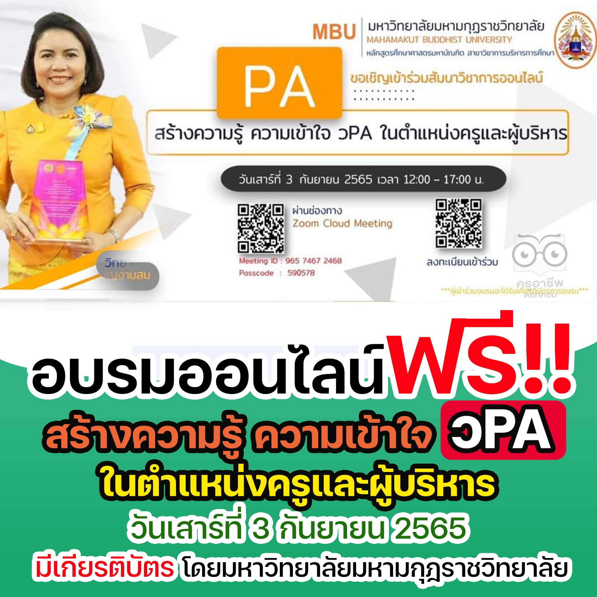 ลิงก์ลงทะเบียนอบรมออนไลน์ฟรี เรื่อง สร้างความรู้ ความเข้าใจ วPA ในตำแหน่งครูและผู้บริหาร วันเสาร์ที่ 3 กันยายน 2565 เวลา 12.00-17:00 น. ผ่าน ZOOM ลงทะเบียนฟรี มีเกียรติบัตร โดยมหาวิทยาลัยมหามกุฎราชวิทยาลัย
