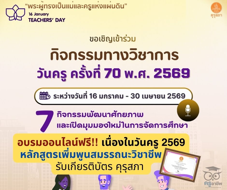 รวมลิงก์ อบรมวันครู 2569 หลักสูตรเพิ่มพูนสมรรถนะวิชาชีพ กิจกรรมวิชาการเนื่องในโอกาสงานวันครู ครั้งที่ 70 พ.ศ. 2569 “พระผู้ทรงเป็นแม่และครูแห่งแผ่นดิน”