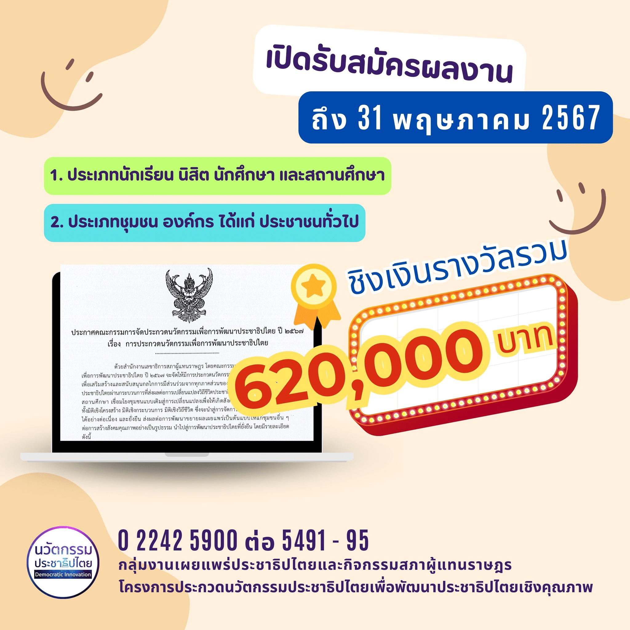 ด้วยสำนักงานเลขาธิการสภาผู้แทนราษฎร โดยคณะกรรมการจัดประกวดนวัตกรรมเพื่อการพัฒนาประชาธิปไตย ปี ๒๕๖๗ จะจัดให้มีการประกวดนวัตกรรมเพื่อการพัฒนาประชาธิปไตยเพื่อเสริมสร้างและสนับสนุนกลไกการมีส่วนร่วมจากทุกภาคส่วนของสังคมที่สะท้อนถึงการพัฒนาประชาธิปไตยผ่านกระบวนการที่ส่งผลต่อการเปลี่ยนแปลงวิถีชีวิตประชาธิปไตยจากพื้นฐานของโรงเรียนสถานศึกษา เชื่อมโยงชุมชนแบบเดิมสู่การเปลี่ยนแปลงเพื่อให้เกิดสังคมประชาธิปไตยที่มีคุณภาพทั้งมิติเชิงโครงสร้าง มิติเชิ่งกระบวนการ มิติเชิงวิถีชีวิต ซึ่งจะนำสู่การจัดการแก้ไขปัญหาสังคม/ชุมชนได้อย่างต่อเนื่อง และยั่งยืน ส่งผลต่อการพัฒนาขยายผลเผยแพร่เป็นต้นแบบให้แก่ชุมชนอื่น ๆต่อการสร้างสังคมคุณภาพอย่างเป็นรูปธรรม นำไปสู่การพัฒนาประชาธิปไตยที่ยั่งยืน