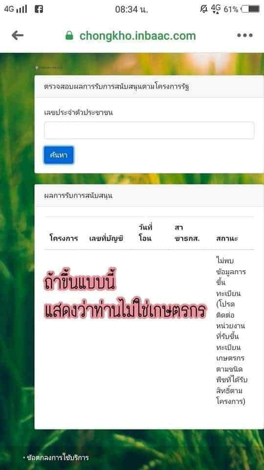 • กรณีตรวจสอบผ่านเว็บไซต์ chongkho.inbaac.com หากขึ้นข้อความ ไม่พบข้อมูลการขึ้นทะเบียน (โปรดติดต่อหน่วยงานที่รับขึ้นทะเบียนเกษตรกรตามชนิดพืชที่ได้รับสิทธิ์ตามโครงการ) แสดงว่า ไม่มีสถานะเป็นเกษตรกร ตรวจสอบสถานะการเป็นเกษตรกร คลิกที่นี่