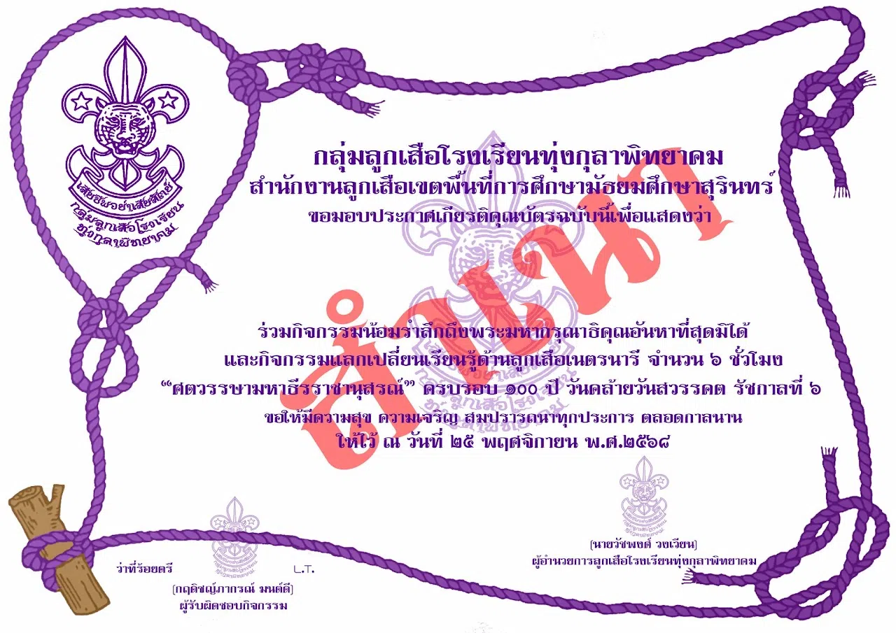 กิจกรรมน้อมรำลึกถึงพระมหากรุณาธิคุณอันหาที่สุดมิได้ และกิจกรรมแลกเปลี่ยนเรียนรู้ด้านลูกเสือ “ศตวรรษามหาธีรราชานุสรณ์” ครบรอบ ๑๐๐ ปี วันสวรรคต รัชกาลที่ ๖ (๒๕ พฤศจิกายน ๒๕๖๘) รับเกียรติบัตรจากโรงเรียนทุ่งกุลาพิทยาคม