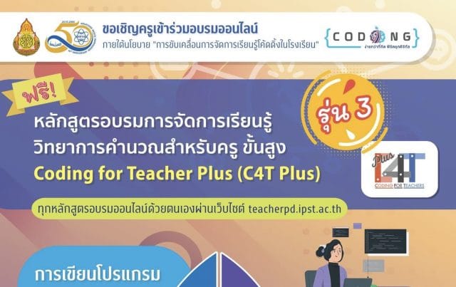 มาแล้วครูจ๋า หลักสูตร Plus ที่ครูอยากได้ สพฐ. และ สสวท. ขอเชิญครูประถม และมัธยมที่สนใจเข้าร่วมอบรมด้วยตนเองแบบออนไลน์ “หลักสูตรการจัดการเรียนรู้วิทยาการคำนวณสำหรับครู ขั้นสูง (Coding for Teacher Plus: C4T Plus)” รุ่นที่ 3