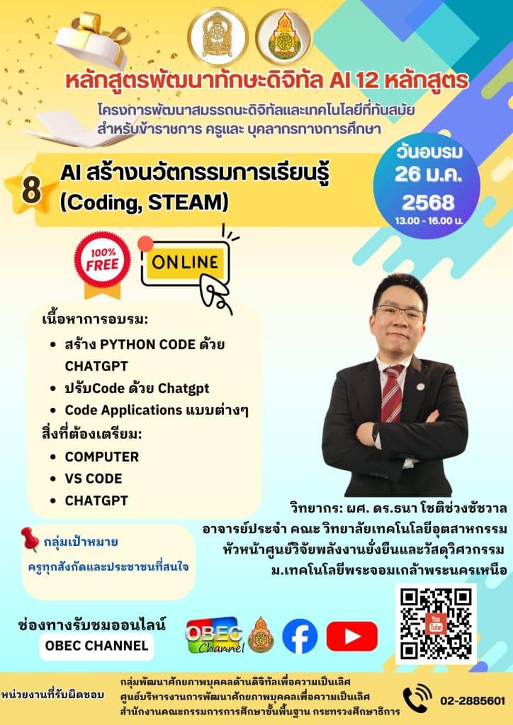 🛜ขอเชิญชวนคุณครูและบุคลากรทางการศึกษาทุกท่าน มาร่วมเป็นส่วนหนึ่งในการพัฒนาการศึกษาไทยด้วย AI ผ่าน 12 หลักสูตรที่ได้รับการออกแบบมาเป็นพิเศษ