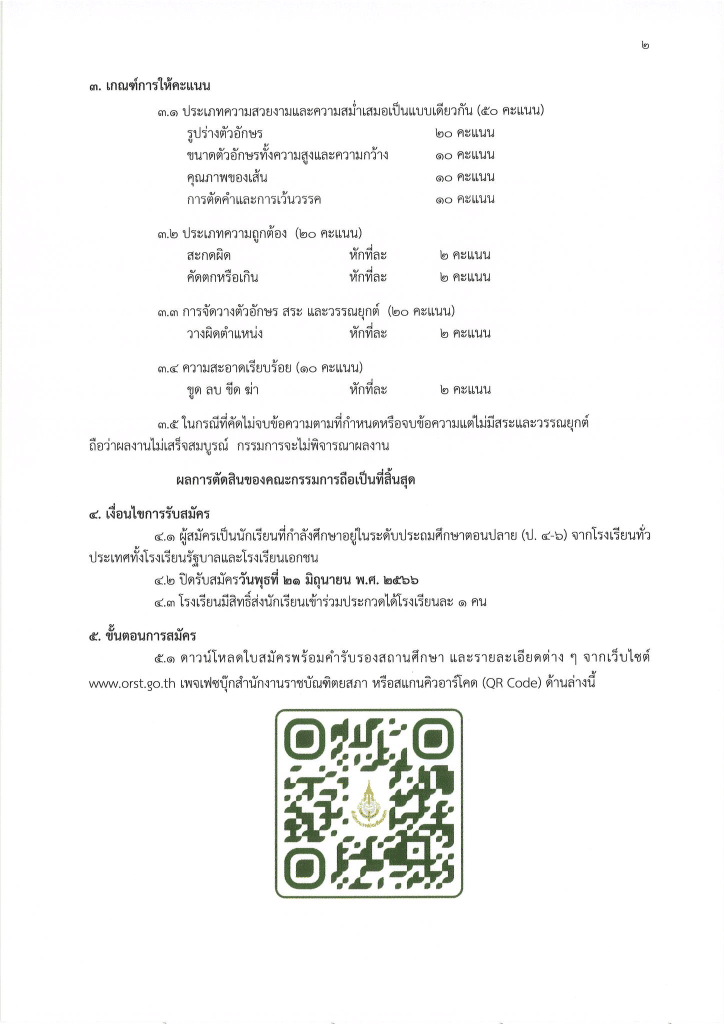 สำนักงานราชบัณฑิตยสภา ประกวดคัดลายมือของนักเรียน ระดับชั้น ป. 4-6 ส่งผลงานภายใน 23 มิถุนายน พ.ศ. 2566