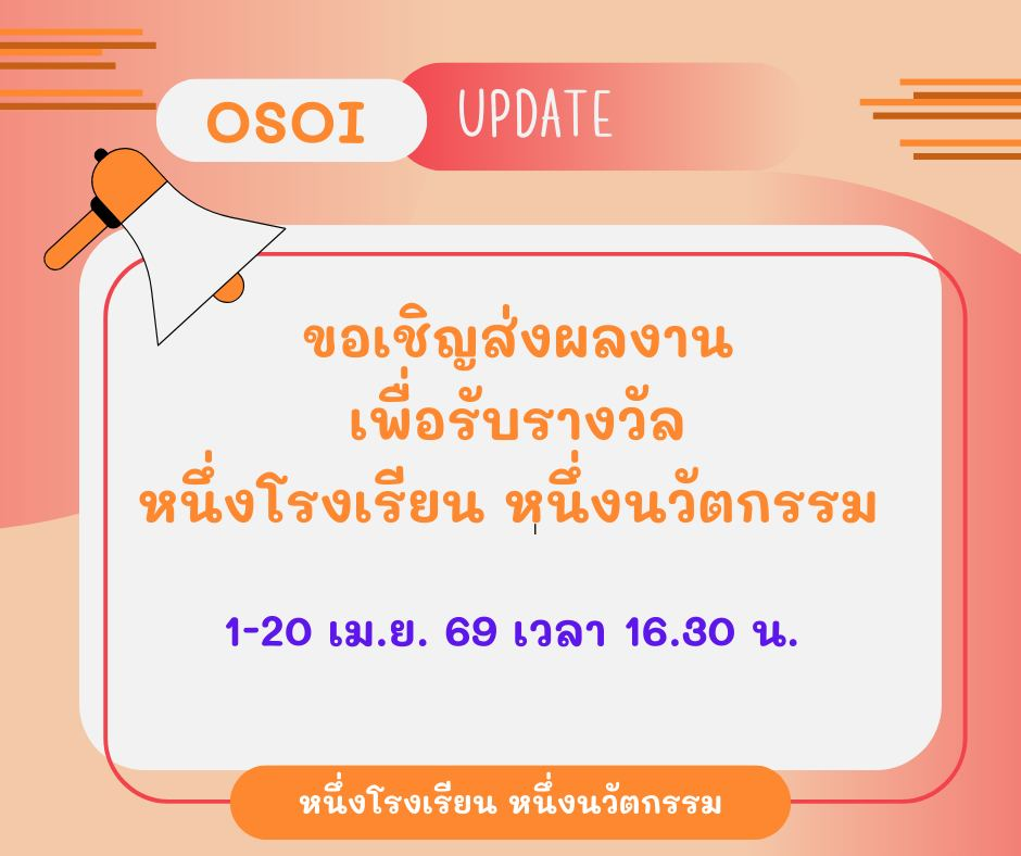 ขอเชิญสถานศึกษาส่งผลงานเพื่อเข้ารับการคัดสรรรางวัล หนึ่งโรงเรียน หนึ่งนวัตกรรม ประจำปี 2569 ส่งผลงานภายใน 20 เมษายน 2569