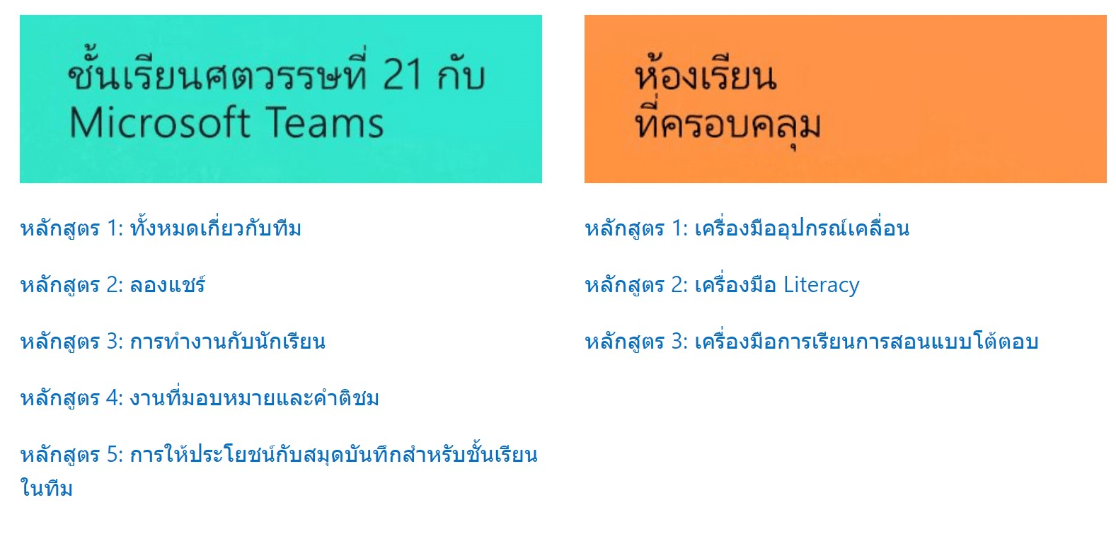 ภายในแต่ละหลักสูตร คุณครูจะพบสื่อการเรียนที่ต้องการเพื่อส่งเสริมส่วนการฝึกอบรมของครูแบบทำงานร่วมกัน การเลือกหลักสูตรจะนำไปยังไซต์ Microsoft Educator Community เพื่อเรียนรู้เพิ่มเติมและดาวน์โหลดหลักสูตรที่สมบูรณ์ฟรี