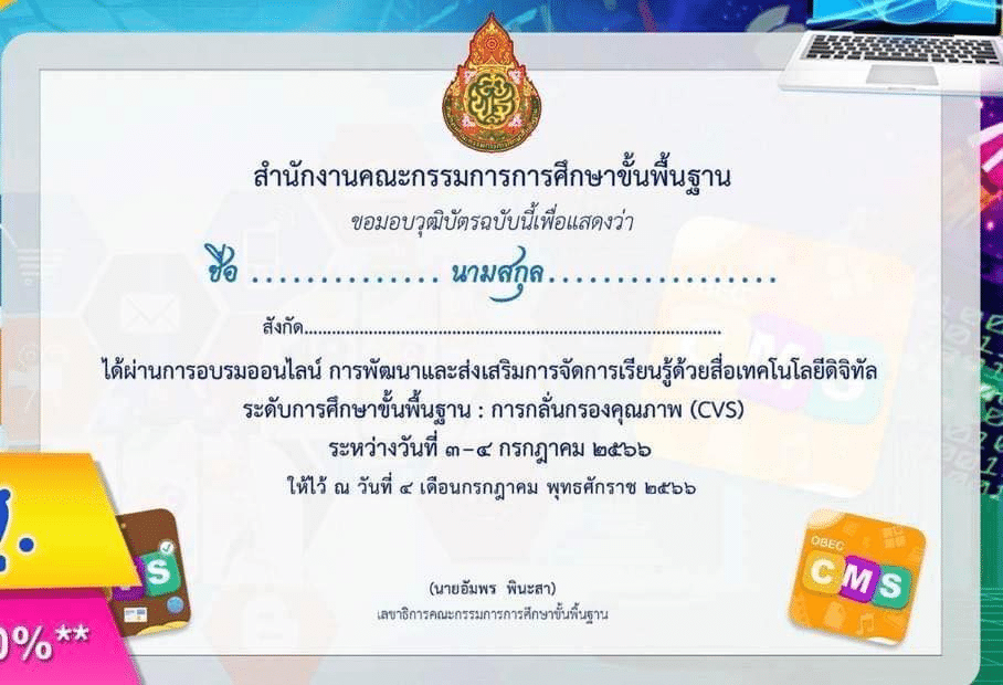 อบรมออนไลน์การพัฒนาและส่งเสริมการจัดการเรียนรู้ด้วยสื่อเทคโนโลยีดิจิทัล เรื่อง “การกลั่นกลองคุณภาพ (CVS) ” OBEC Content Center รับวุฒิบัตร สพฐ.