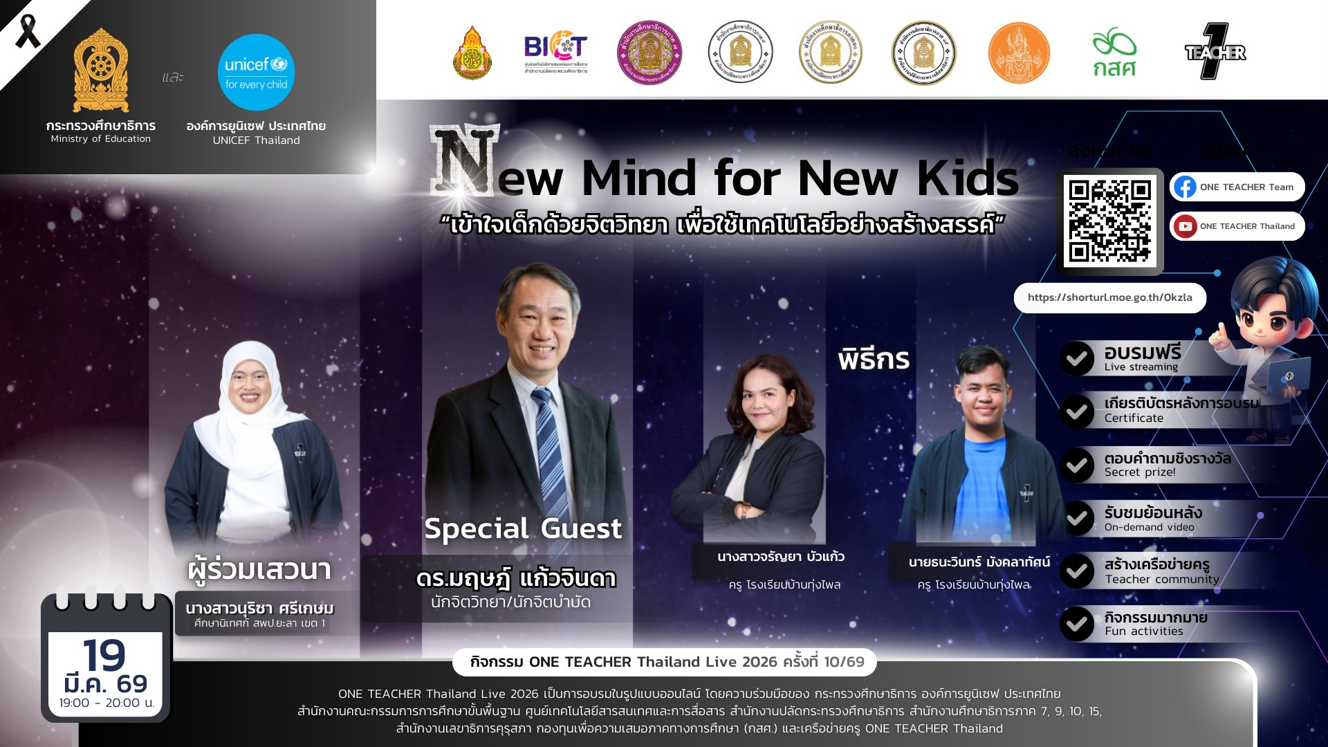 อบรมออนไลน์ฟรี ครั้งที่ 10 OTT LIVE หัวข้อ New Mind for New Kids เข้าใจเด็กด้วยจิตวิทยา เพื่อใช้เทคโนโลยีอย่างสร้างสรรค์ วันที่ 19 มีนาคม 2569 รับเกียรติบัตรจาก กระทรวงศึกษาธิการ