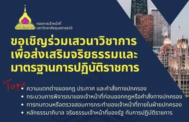 มหาวิทยาลัยอุบลราชธานี โดย กองการเจ้าหน้าที่ ขอเชิญชวนผู้บริหาร บุคลากร นักศึกษา และผู้สนใจ เข้าร่วมการเสวนาทางวิชาการเพื่อส่งเสริมจริยธรรมและมาตรฐานการปฏิบัติราชการที่ดี ผ่านระบบออนไลน์