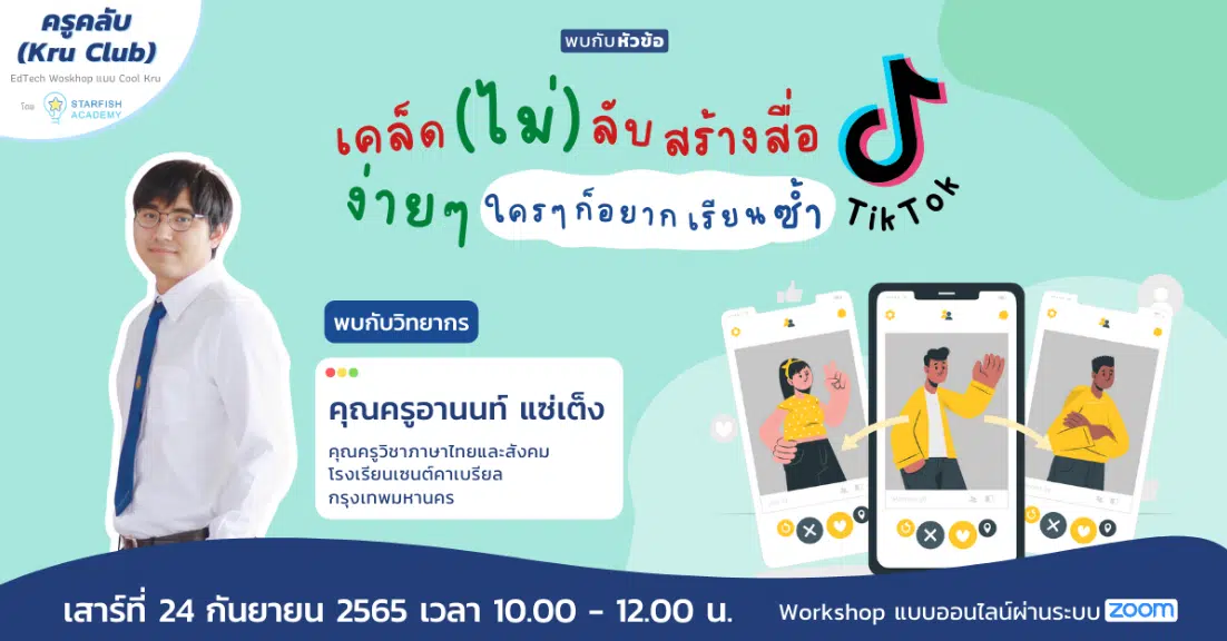 ครูยุคใหม่มารวมตัวกันค่าา!! Workshop ครั้งนี้วิทยากร รับเชิญของเรา แบ่งปันเคล็ดลับสร้างสื่อการสอนง่ายๆจากเรื่องราวรอบตัวด้วย tiktok โดยครูขาแร็พที่มียอดไลค์หลายล้านคน ร่วมค้นหาคำตอบว่าสร้างเนื้อหาการเรียนรู้ยังไงให้น่าดึงดูดใจ บันเทิง และเรียนรู้ได้ในเวลาเดียวกัน เชิญทุกท่านมาร่วมเรียนรู้ด้วยกันผ่านระบบ zoom วันเสาร์ที่ 24 กันยายน 2565 เวลา 10:00 – 12:00 น.