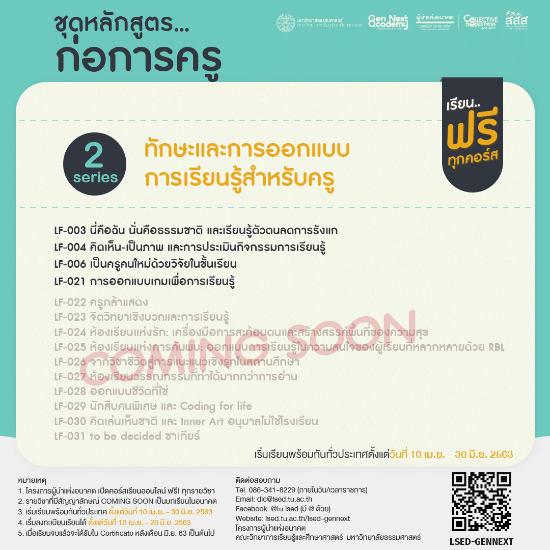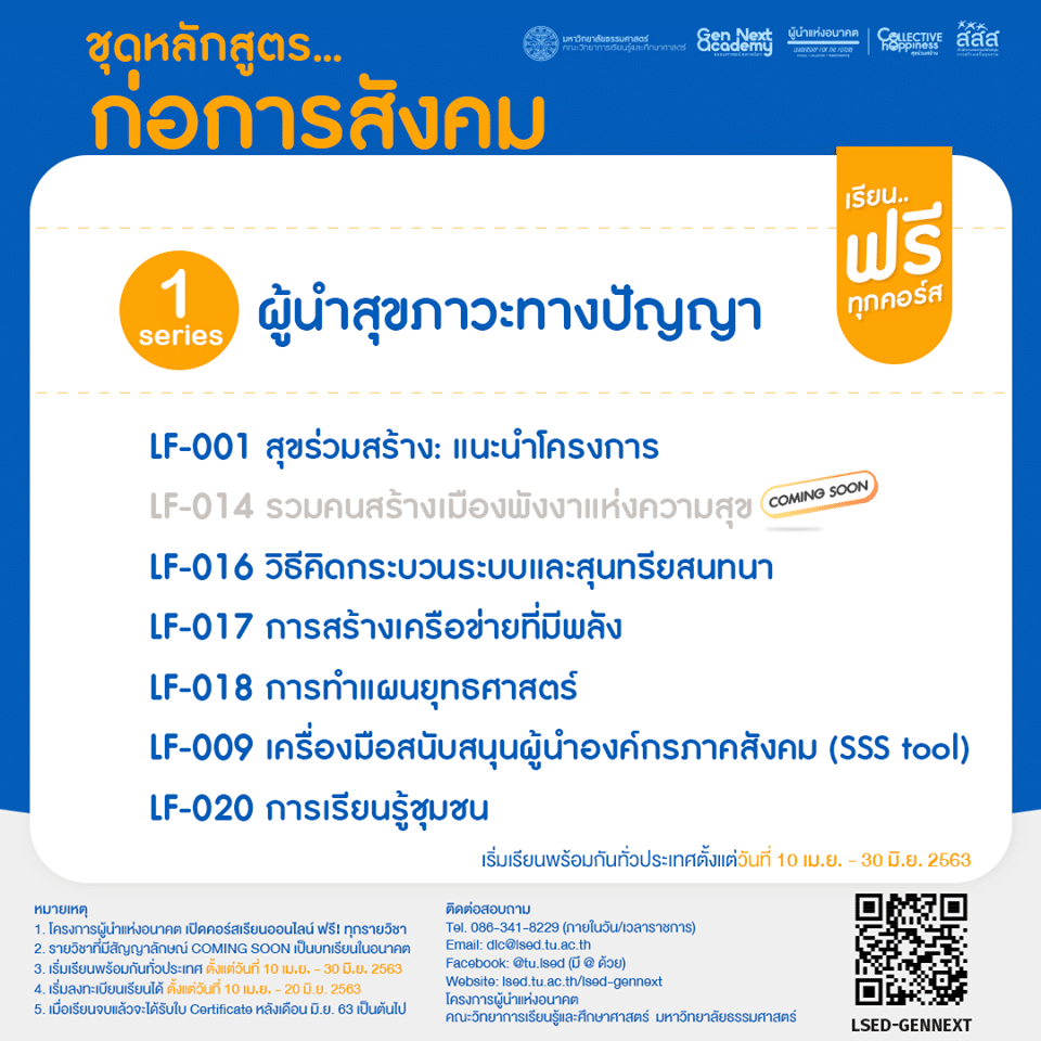 1. โครงการผู้นำแห่งอนาคต เปิดคอร์สเรียนออนไลน์ ฟรี!! ทุกรายวิชา: https://lsed.tu.ac.th/lsed-gennext