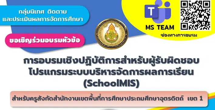 เชิญชวนผู้บริหารและคณะครูที่สนใจเข้ารับการอบรมเชิงปฏิบัติการสำหรับผู้รับผิดชอบโปรแกรมบริหารจัดการผลการเรียน (SchoolMIS) ผ่านระบบ Microsoft Team