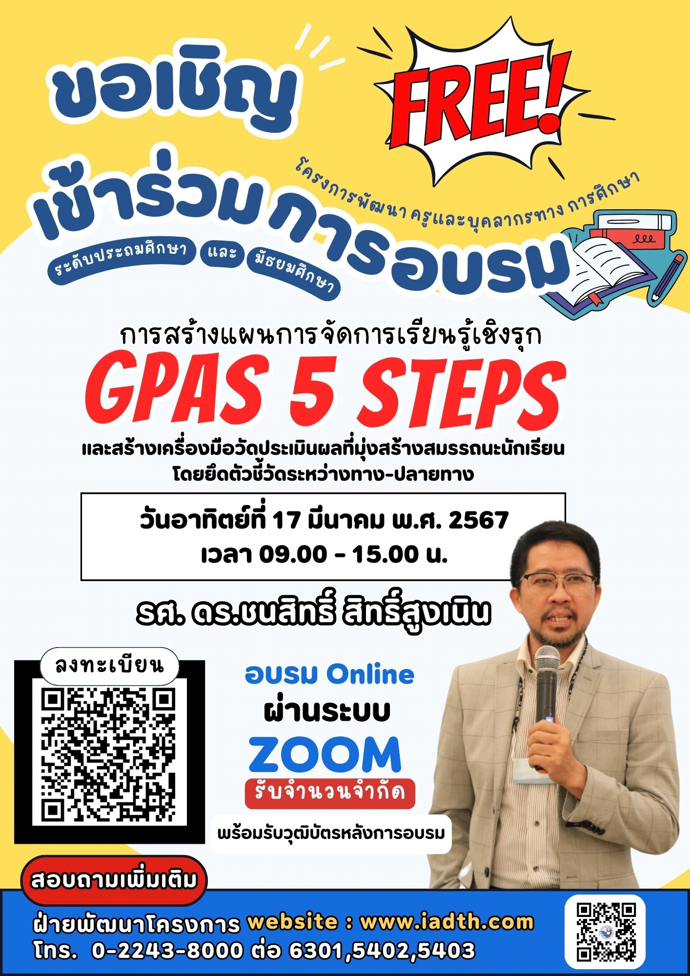 อบรมออนไลน์ การสร้างแผนการจัดการเรียนรู้เชิงรุก GPAS 5 Steps และสร้างเครื่องมือวัดประเมินผลที่มุ่งสร้างสมรรถนะนักเรียน โดยยึดตัวชี้วัดระหว่างทาง-ปลายทาง วันอาทิตย์ที่ 17 มีนาคม 2567 รับเกียรติบัตรฟรี โดย พว.