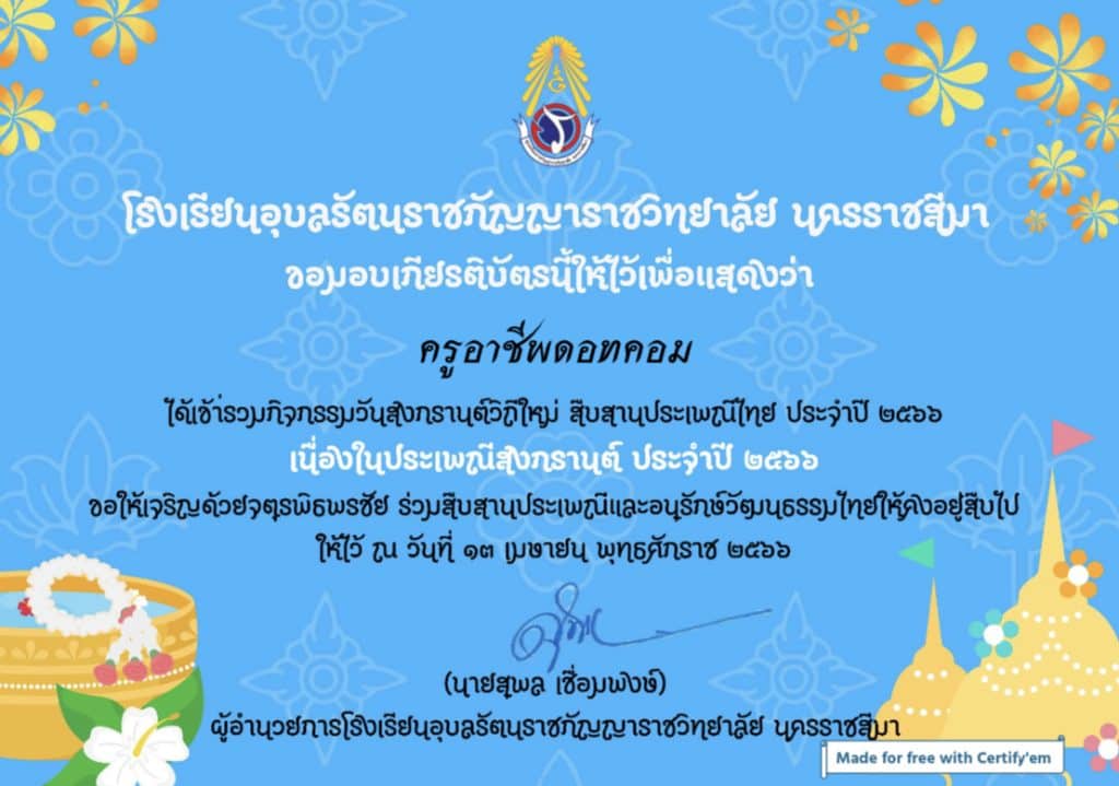 เกียรติบัตรฟรี กิจกรรมวันสงกรานต์วิถีใหม่ สืบสานประเพณีไทย ประจำปี 2566 รับเกียรติบัตรฟรี ทางอีเมล โรงเรียนอุบลรัตนราชกัญญาราชวิทยาลัย นครราชสีมา