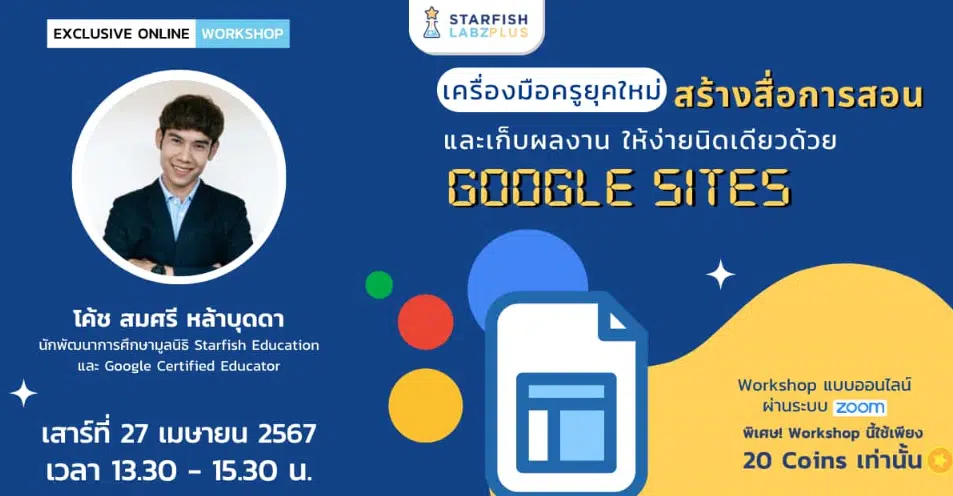 อบรมออนไลน์ฟรี เครื่องมือครูยุคใหม่ สร้างสื่อการสอนและเก็บผลงาน ให้ง่ายนิดเดียวด้วย Google Sites วันที่ 27 เมษายน 2567 รับเกียรติบัตรฟรี จากStarfish Labz