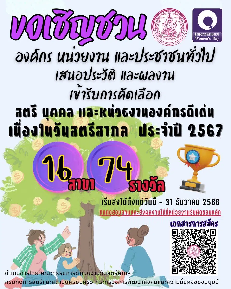 เชิญชวนองค์กร หน่วยงาน ประชาชนทั่วไป เสนอประวัติและผลงานเข้ารับคัดเลือกสตรี บุคคล และหน่วยงานองค์กรดีเด่น เนื่องในวันสตรีสากล ประจำปี 2567 จำนวน 16 สาขา 74 รางวัล ผู้สนใจสามารถดาวน์โหลดรายละเอียดเอกสารการสมัครได้ทาง QR Code ตั้งแต่จบัดนี้ ถึงวันที่ 17 มกราคม 2567