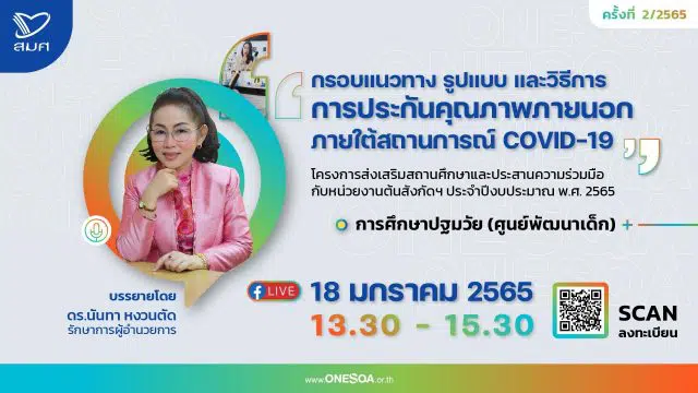เชิญรับชม Facebook Live หัวข้อ “กรอบแนวทาง รูปแบบ และวิธีการประกันคุณภาพภายนอกภายใต้สถานการณ์ COVID-19” ศูนย์พัฒนาเด็ก วันที่ 18 มกราคม 2565 เวลา 13.30 น. รับเกียรติบัตรฟรี จาก สมศ.