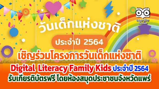 เชิญร่วมโครงการวันเด็ก Digital Literacy Family Kids ประจำปี 2564 รับเกียรติบัตรฟรี โดยห้องสมุดประชาชนจังหวัดแพร่ กศน.อำเภอเมืองแพร่ เนื่องจากCOVID-19 ที่กำลังระบาดอยู่ในขณะนี้ ทำให้ต้องปรับการจัดกิจกรรมให้สอดคล้องกับสถานการณ์โดยสามารถร่วมกิจกรรมได้ที่ลิงค์ข้างล่างนี้ได้เลยจ้า