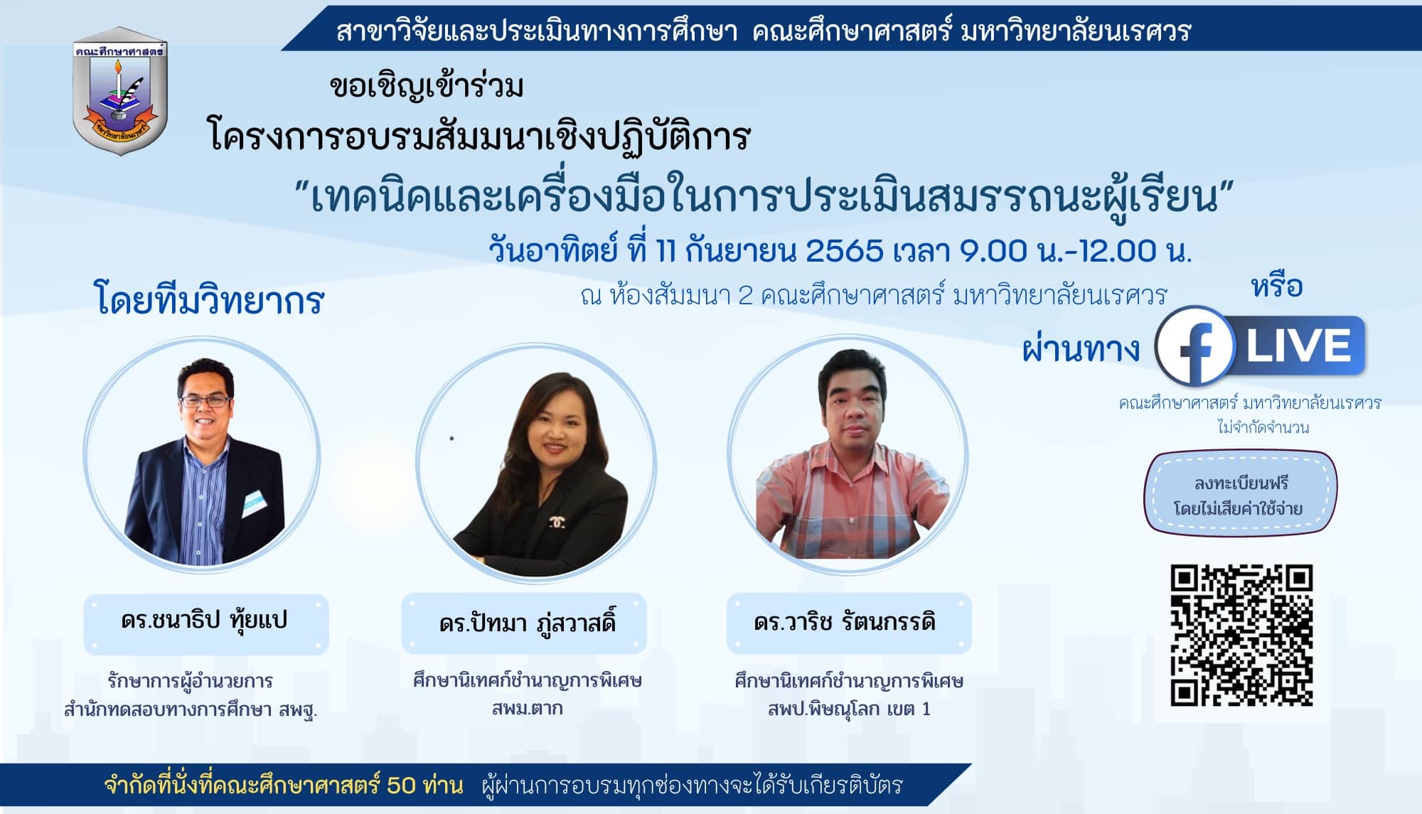 สาขาวิจัยและประเมินทางการศึกษา ภาควิชาบริหาร วิจัย และพัฒนานวัตกรรมทางการศึกษา คณะศึกษาศาสตร์ มหาวิทยาลัยนเรศวร ขอเรียนเชิญเข้าร่วมโครงการอบรมเชิงปฏิบัติการ เรื่อง “เทคนิค และเครื่องมือ ในการประเมินสมรรถนะผู้เรียน” ลงทะเบียนฟรี!!!! ผู้ผ่านการอบรมทุกช่องทางจะได้รับเกียรติบัตร จากคณะศึกษาศาสตร์ มหาวิทยาลัยนเรศวร