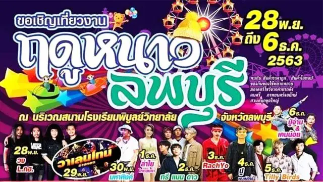 ขอเชิญเที่ยวงานฤดูหนาวลพบุรี ณ สนามโรงเรียนพิบูลวิทยาลัย วันที่ 28 พ.ย 63 ถึง 6 ธ.ค 63 เที่ยวสนุกทุกย่างก้าวเที่ยวงานฤดูหนาวลพบุรี ณ สนามโรงเรียนพิบูลวิทยาลัย ตำบลทะเลชุบศร อำเภอเมือง จังหวัดลพบุรี วันที่ 28 พ.ย 63 ถึง 6 ธ.ค 63