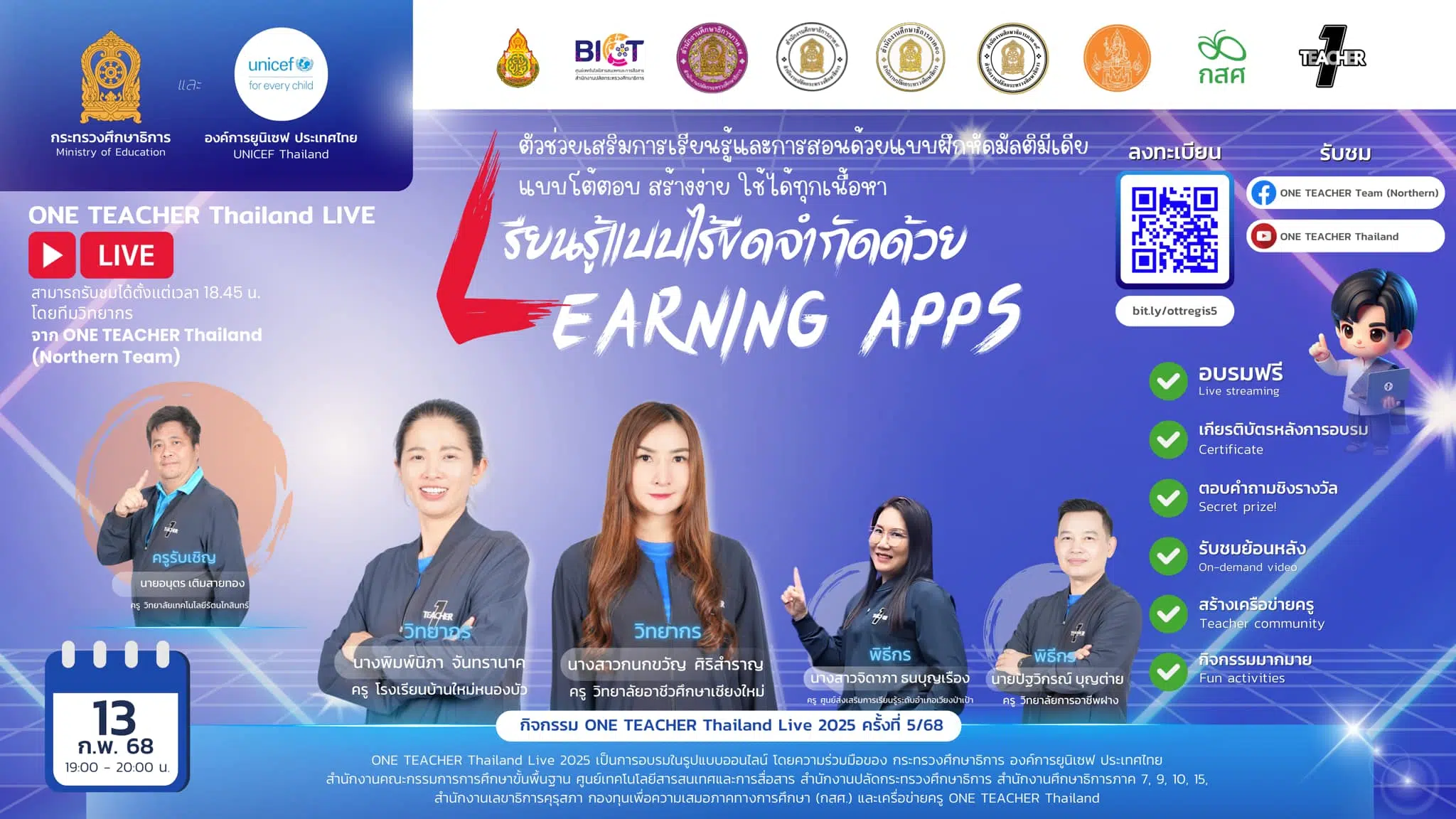 อบรมออนไลน์ ครั้งที่ 5 OTT LIVE หัวข้อ เรียนรู้แบบไร้ขีดจำกัด กับ Learning Apps วันที่ 13 กุมภาพันธ์ 2568 รับเกียรติบัตรจากกระทรวงศึกษาธิการ และองค์การยูนิเชฟ ประเทศไทย