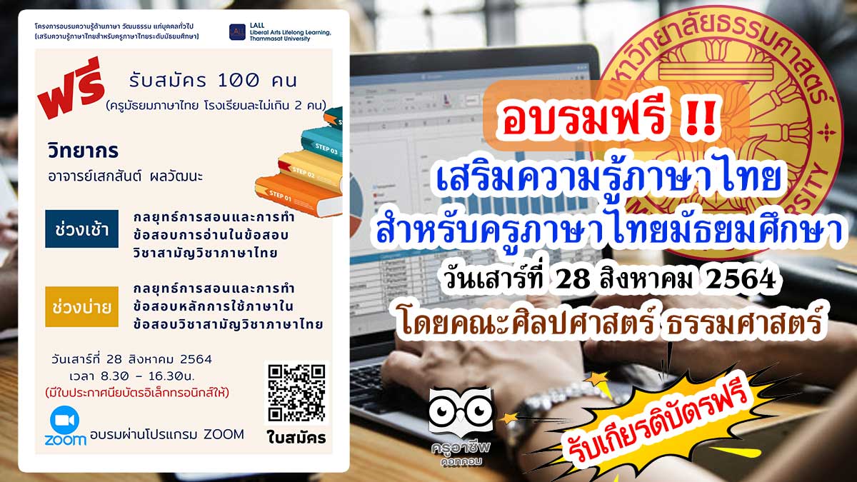 อบรมฟรี!! เสริมความรู้ภาษาไทยสำหรับครูภาษาไทยระดับมัธยมศึกษา วันเสาร์ที่ 28 สิงหาคม 2564 โดยคณะศิลปศาสตร์ ธรรมศาสตร์ รับสมัครจำนวน 100 คน (ครูมัธยมภาษาไทย โรงเรียนละไม่เกิน 2 คน)