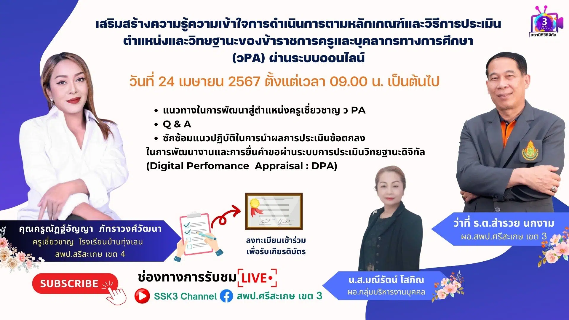 ขอเชิญอบรมผ่านระบบออนไลน์ หลักสูตร เสริมสร้างความรู้ความเข้าใจการดำเนินการตามหลักเกณฑ์และวิธีการประเมินตำแหน่งและวิทยฐานะของข้าราชการครูและบุคลากรทางการศึกษา (วPA) ผ่านระบบออนไลน์ ในวันพุธที่ 24 เมษายน 2567 รับเกียรติบัตรจาก สพป.ศรีสะเกษ เขต 3