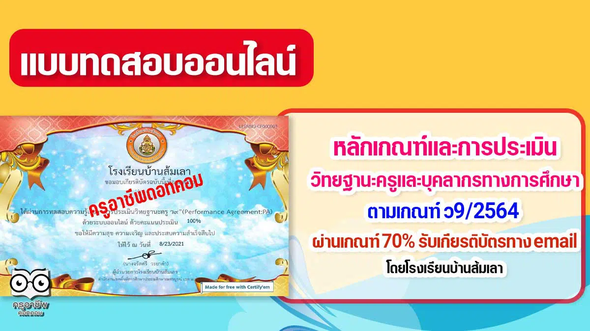 แบบทดสอบความรู้เรื่อง“การประเมินวิทยฐานะครู ว9”(Performance Agreement:PA) ผ่านเกณฑ์ 70% รับเกียรติบัตรทาง Email โดยโรงเรียนบ้านส้มเลา สพป.เพชรบูรณ์เขต 2