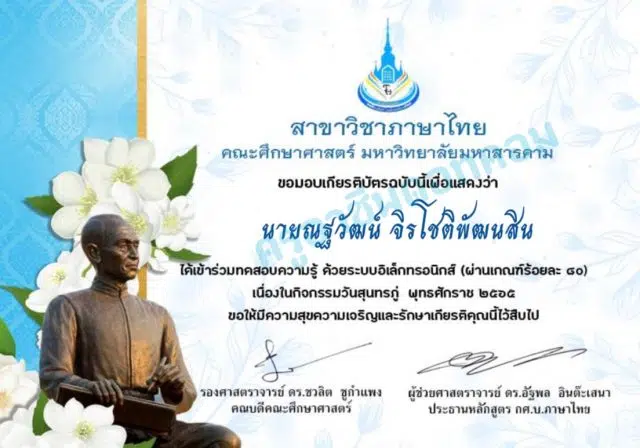 แบบทดสอบวันสุนทรภู่ ประจำปีการศึกษา 2565 (ในรูปแบบออนไลน์) วันที่ 26 มิถุนายน 2565 โดยสาขาวิชาภาษาไทย คณะศึกษาศาสตร์ มหาวิทยาลัยมหาสารคาม