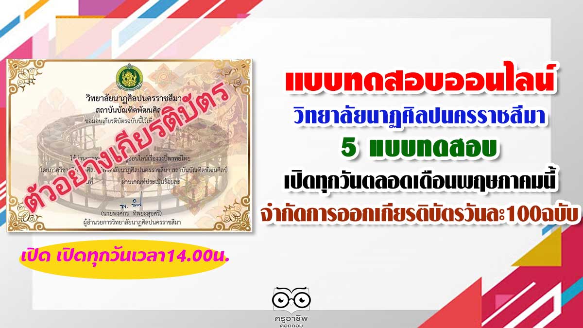 แบบทดสอบออนไลน์ของวิทยาลัยนาฏศิลปนครราชสีมา 5 แบบทดสอบ เปิดทุกวันตลอดเดือนพฤษภาคมนี้ เวลา14.00น. จำกัดการออกเกียรติบัตรวันละ100ฉบับ