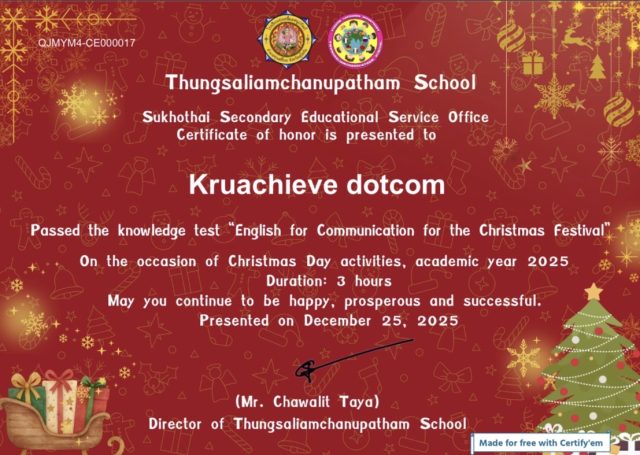 แบบทดสอบออนไลน์ภาษาอังกฤษเพื่อการสื่อสาร พร้อมรับเกียรติบัตร เนื่องในกิจกรรม Christmas Day 2025 ผ่านเกณฑ์ 80% รับเกียรติบัตรทางอีเมล โดยโรงเรียนทุ่งเสลี่ยมชนูปถัมภ์