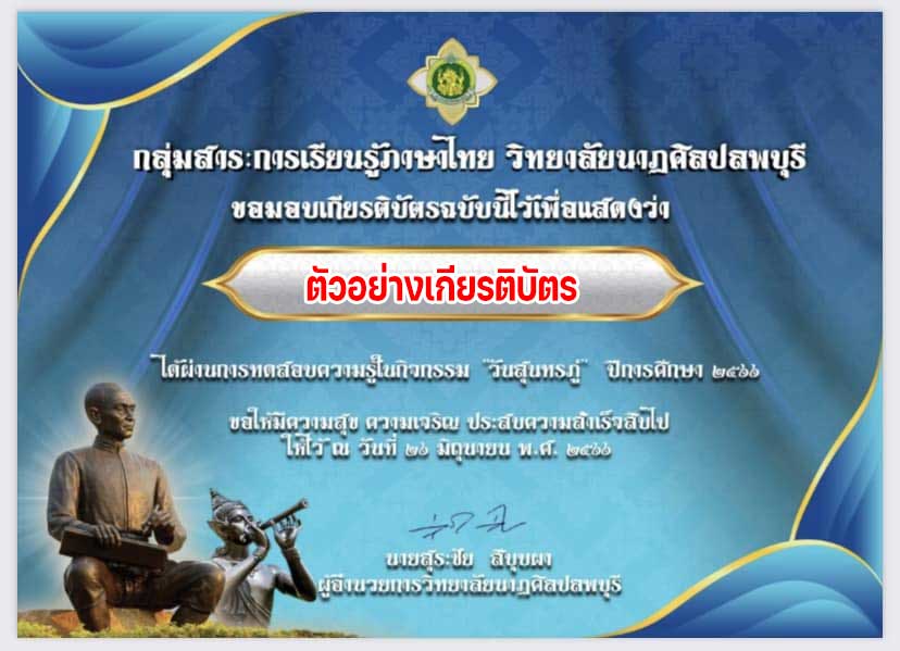 แบบทดสอบออนไลน์เนื่องในวันสุนทรภู่ ปีการศึกษา ๒๕๖๖ ผ่านเกณฑ์ 60% ขึ้นไป จะได้รับเกียรติบัตร์ออนไลน์ทางอีเมล โดยวิทยาลัยนาฏศิลปลพบุรี