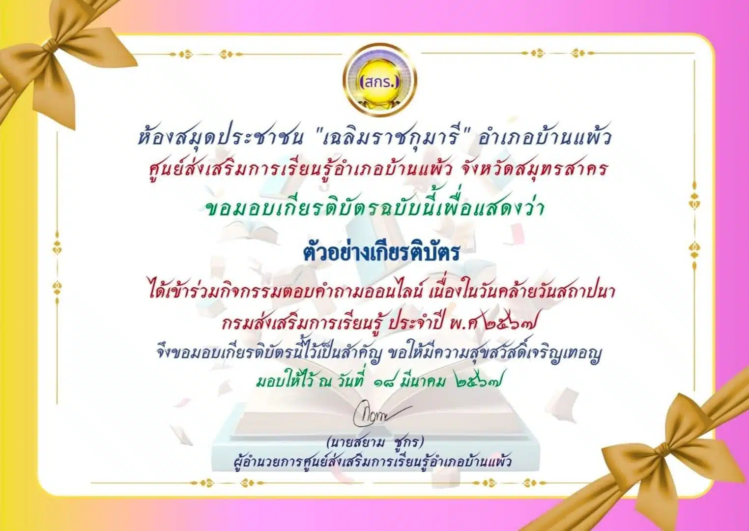 แบบทดสอบออนไลน์เนื่องใน “วันสถาปนากรมส่งเสริมการเรียนรู้ (สกร.) ประจำปี 2567” ผ่าน 70% รับเกียรติบัตรทางอีเมล โดยศูนย์ส่งเสริมการเรียนรู้อำเภอบ้านแพ้ว จังหวัดสมุทรสาคร