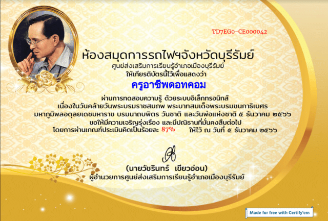 ห้องสมุดการรถไฟฯจังหวัดบุรีรัมย์ ศูนย์ส่งเสริมการเรียนรู้อำเภอเมืองบุรีรัมย์ ขอเชิญชวนร่วมกิจกรรมส่งเสริมการอ่านแบบทดสอบออนไลน์เรื่อง วันคล้ายวันพระราชสมภพพระบาทสมเด็จพระปรมินทรมหาภูมิพลอดุลเดชมหิตลาธิเบศรรามาธิบดี จักรีนฤบดินทร สยามินทราธิราช บรมนาถบพิตร วันชาติและวันพ่อแห่งชาติ หากทำแบบทดสอบผ่าน ๗๐% ท่านจะได้รับเกียรติบัตรแบบอิเล็กทรอนิกส์ผ่าน E-Mail ด้วยระบบอัตโนมัติ