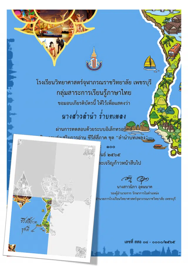 แบบทดสอบออนไลน์ กิจกรรมส่งเสริมการอ่าน ซีรี่ย์สี่ภาค ชุดที่ ๔ ลำนำ บทเพลง ผ่านเกณฑ์ร้อยละ ๗๐ รับเกียรติบัตรทางอีเมล โดยโรงเรียนวิทยาศาสตร์จุฬาภรณราชวิทยาลัย เพชรบุรี