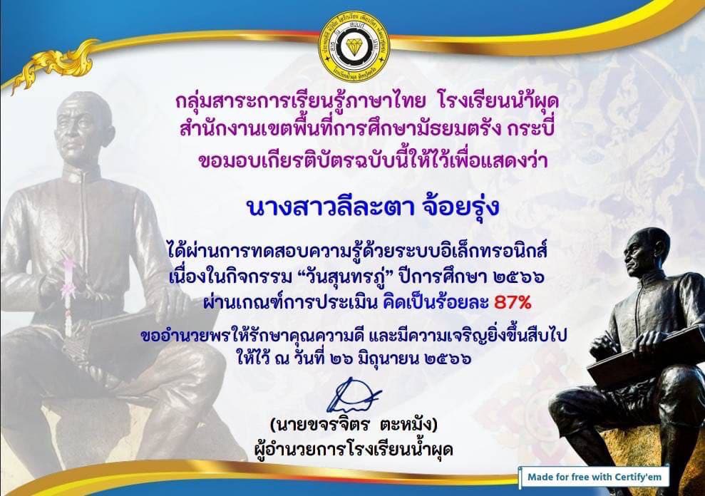 แบบทดสอบออนไลน์ กิจกรรมเนื่องใน “วันสุนทรภู่” ๒๖ มิถุนายน ๒๕๖๖ ผ่านเกณฑ์ร้อยละ ๗๐ จะได้รับเกียรติบัตรทางอีเมล โดยโรงเรียนน้ำผุด