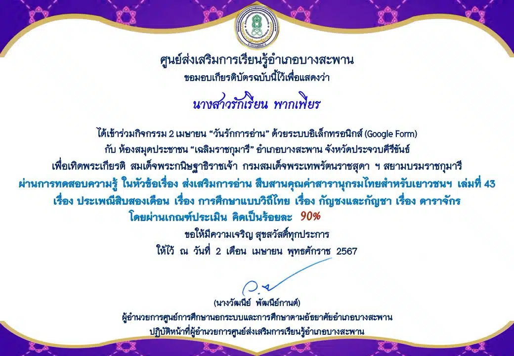 แบบทดสอบออนไลน์ กิจกรรม 2 เมษายน “วันรักการอ่าน” สารานุกรมไทยสำหรับเยาวชนฯ เล่มที่ 43 รับเกียรติบัตรทางอีเมล โดยห้องสมุดประชาชน “เฉลิมราชกุมารี” อำเภอบางสะพาน