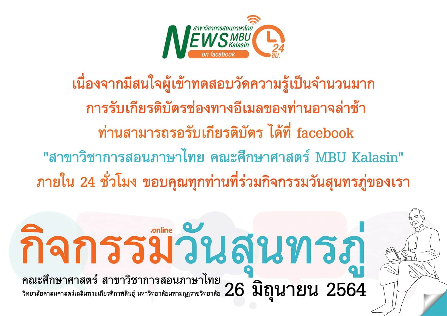 เนื่องจากมีสนใจผู้เข้าทดสอบวัดความรู้เป็นจำนวนมาก การรับเกียรติบัตรช่องทางอีเมลของท่านอาจล่าช้า ท่านสามารถรอรับเกียรติบัตร ได้ที่ facebook “สาขาวิชาการสอนภาษาไทย คณะศึกษาศาสตร์ MBU Kalasin” ภายใน 24 ชั่วโมง ขอบคุณทุกท่านที่ร่วมกิจกรรมวันสุนทรภู่ของเรา