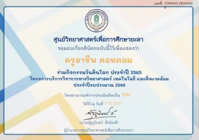 แบบทดสอบออนไลน์ เนื่องในวันดินโลก ประจำปี 2565 ผ่านเกณฑ์ 60% รับเกียรติบัตรทางอีเมล โดยศูนย์วิทยาศาสตร์เพื่อการศึกษายะลา