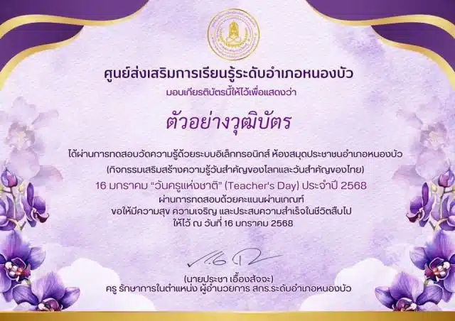 แบบทดสอบออนไลน์ เนื่องในวันครูแห่งชาติ 2568 ผ่าน80%ท่านจะได้รับเกียรติบัตรทางอีเมล โดยศูนย์ส่งเสริมการเรียนรู้ระดับอำเภอหนองบัว