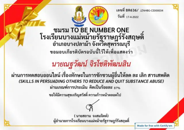 แบบทดสอบออนไลน์ เรื่องทักษะในการชักชวนผู้อื่นให้ลด ละ เลิก สารเสพติด ผ่านเกณฑ์ 75% รับเกียรติบัตรทางอีเมล โดยโรงเรียนบางแม่ม้ายรัฐราษฏร์รังสฤษดิ์ อำเภอบางปลาม้า จังหวัดสุพรรณบุรี