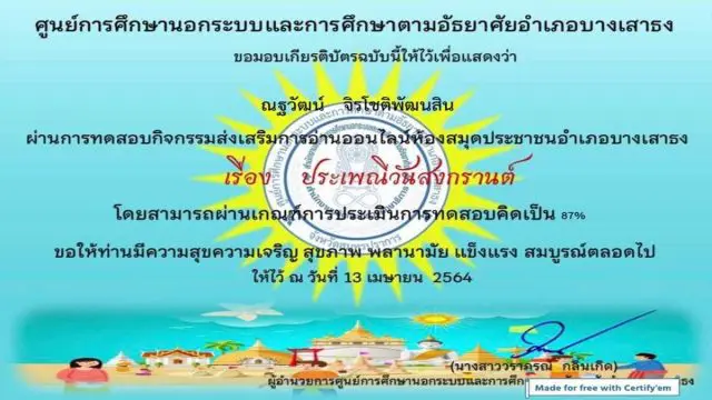 แบบทดสอบออนไลน์ เรื่อง ประเพณีสงกรานต์ โดย กศน.อำเภอบางเสาธง ผ่านเกณฑ์ รับเกียรติบัตรทางอีเมล์
