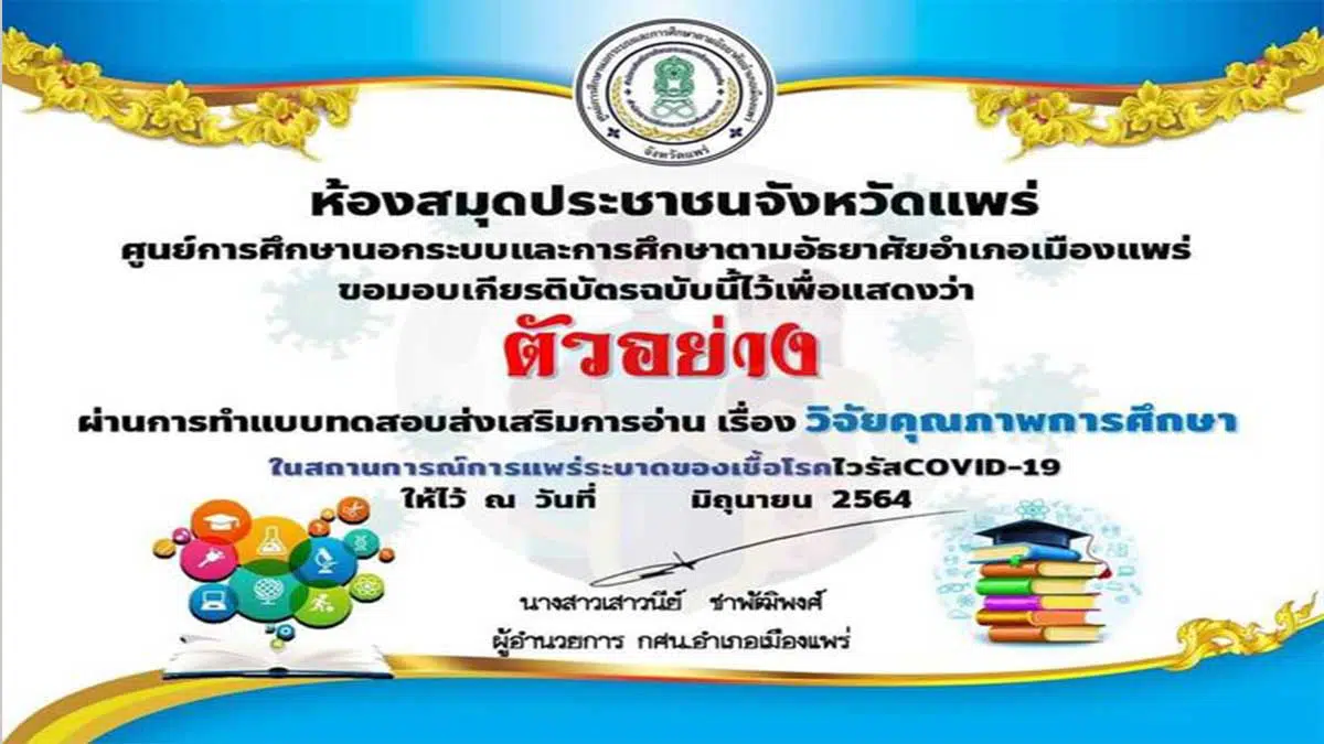 เชิญร่วมทำแบบทดสอบส่งเสริมการอ่าน เรื่องวิจัยทางการศึกษา ด้วยระบบอิเล็กทรอนิกส์ ตั้งแต่ 1-30 มิถุนายน 2564 เนื่องจากในสถานการณ์การณ์แพร่ระบาดของเชื้อโรคไวรัส COVID-19 โดยห้องสมุดประชาชนจังหวัดแพร่ กศน.อำเภอเมืองแพร่ สำนักงาน กศน.จังหวัดแพร่ เมื่อตอบคำถามถูกร้อยละ 70 คะแนน ขึ้นไปถือว่าท่านผ่านเกณฑ์การทดสอบ สามารถดาวน์โหลดเกียรติบัตรได้ทันที