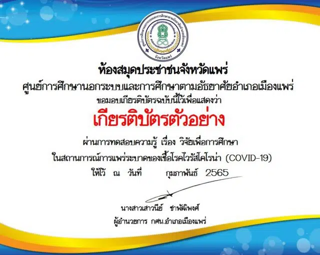 ศูนย์การเรียนรู้ต้นแบบ Co-Learning Space ห้องสมุดประชาชนจังหวัดแพร่ กศน.อำเภอเมืองแพร่ ขอเชิญชวนทุกท่านร่วมกิจกรรมแบบทดสอบออนไลน์ เรื่อง วิจัยเพื่อการศึกษา ประจำปี 2565 ในสถานการณ์การแพร่ระบาดของเชื้อโรคไวรัส โคโรน่า (COVID-19) ท่านที่ทำแบบทดสอบผ่าน 70% ขึ้นไป