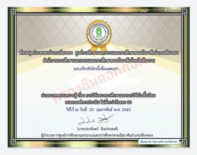 แบบทดสอบออนไลน์ เรื่อง การวิจัยทางการศึกษาและการวิจัยในชั้นเรียน ผ่านเกณฑ์ 80% รับเกียรติบัตรทางอีเมล โดยห้องสมุดประชาชนอำเภอเชียงของ