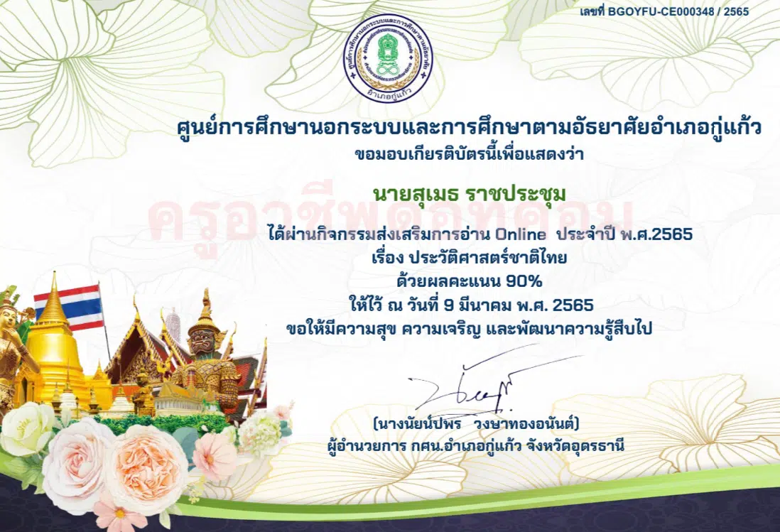 แบบทดสอบออนไลน์ เรื่อง ประวัติศาสตร์ชาติไทย ประจำปีพ.ศ.2565 ผ่านเกณฑ์ 70% รับเกียรติบัตรทางอีเมล โดย กศน.อำเภอกู่แก้ว