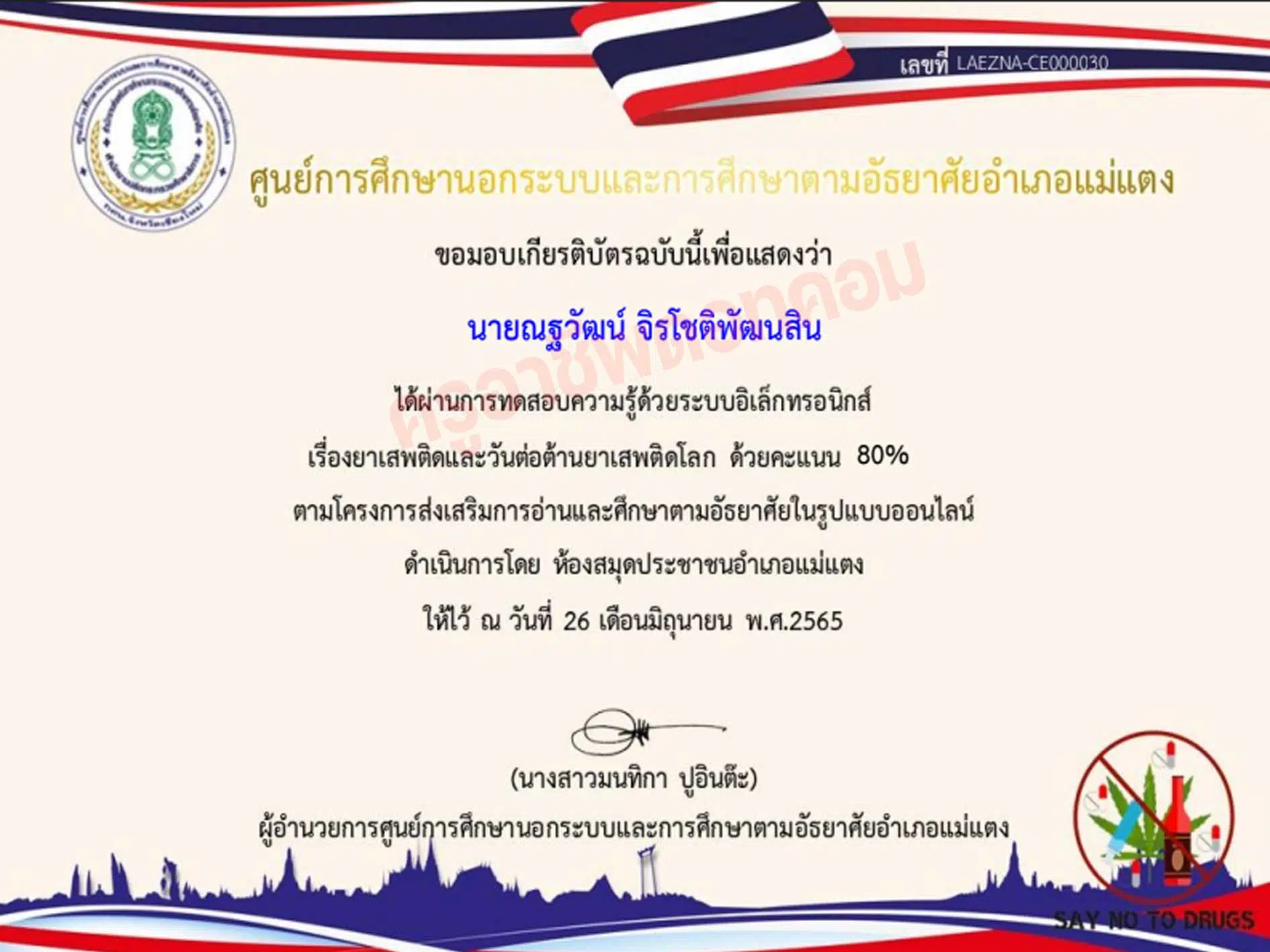 แบบทดสอบออนไลน์ เรื่อง ยาเสพติดและวันต่อต้านยาเสพติดโลก ผ่านเกณฑ์ร้อยละ 80 ขึ้นไป รับเกียรติบัตรทางอีเมล โดย ห้องสมุดประชาชนอำเภอแม่แตง