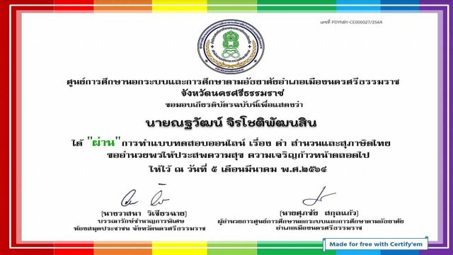 แบบทดสอบออนไลน์ เรื่อง คำ สำนวน และสุภาษิตไทย ผ่านเกณฑ์ รับเกียรติบัตรทางอีเมล โดยกศน.ตำบลนาเคียน
